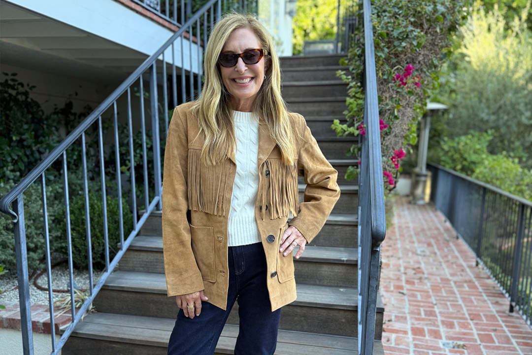 There’s a reason I decided to write about fringe: my new coat from Madewell! I’m crazy for all things suede right now, and the shacket is the perfect weight for LA. I can actually wear it at night and feel like it’s really fall. Tuckernuck’s chestnut brown version is more romantic, less utilitarian. I love the romantic bell sleeves and the long swing of the fringe.